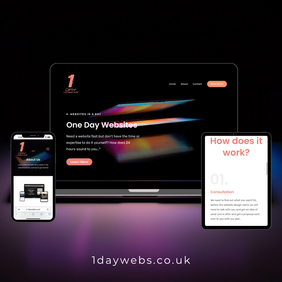 Our One Day Website service is tailored to support small business owners in competing with their larger counterparts. We offer streamlined, responsive, and professional websites at a fraction of the usual cost.