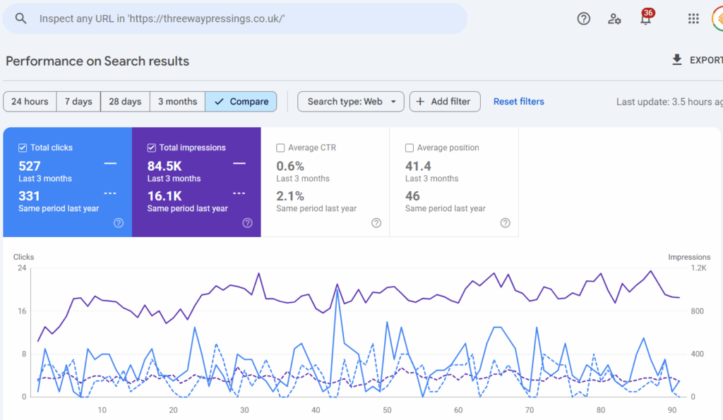 The data from our SEO software shows that clicks to the website from the Google search results have increased by almost 60% over the past 3 months, when compared to the same 3-month period last year, while impressions of the website in the search results have increased by 425% over the same time frame: