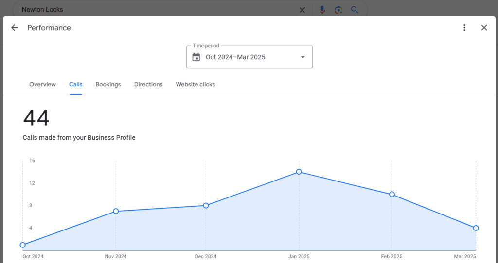 Since the launch of their website and SEO campaign, both the Newton Locks website and Google Business Profile have generated a steady flow of high-quality leads. For instance, over the past five months alone, the Google Business Profile has recorded 44 phone enquiries, demonstrating strong and sustained customer engagement.