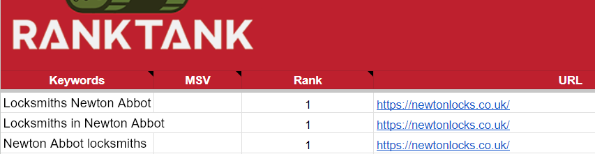 As a direct result of our SEO efforts, Newton Locks now ranks in position 1 on Google’s search results for all targeted Newton Abbot-related keywords.